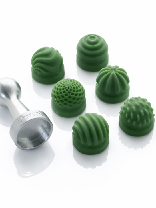 Elevate your chocolate creations with precision and elegance using the Vørmh Silicone Chocolate Stamps. Designed for artisanal chocolatiers and home confectioners alike, this set includes 6 interchangeable silicone stamp heads featuring intricate line and bubble patterns, ideal for adding a refined finish to molded chocolates (30mm diameter).