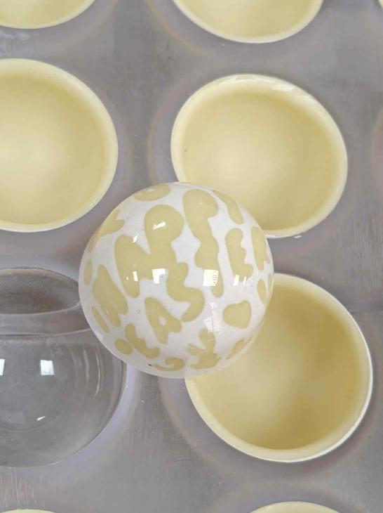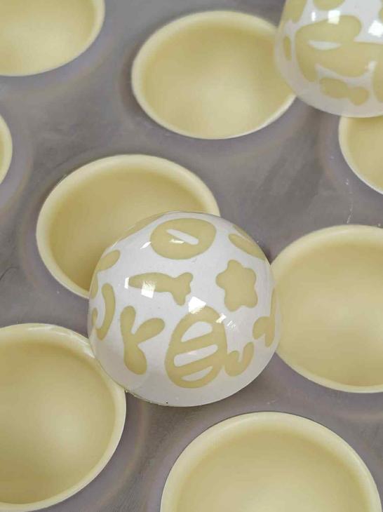 Simply spray your mould with cocoa butter, press the stamp into the mould cavity, and create a refined decorative pattern that will appear on the finished chocolate.