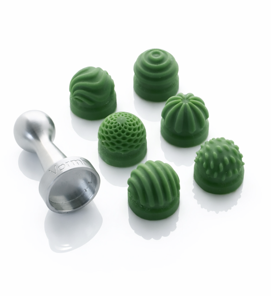 Elevate your chocolate creations with precision and elegance using the Vørmh Silicone Chocolate Stamps. Designed for artisanal chocolatiers and home confectioners alike, this set includes 6 interchangeable silicone stamp heads featuring intricate line and bubble patterns, ideal for adding a refined finish to molded chocolates (30mm diameter).